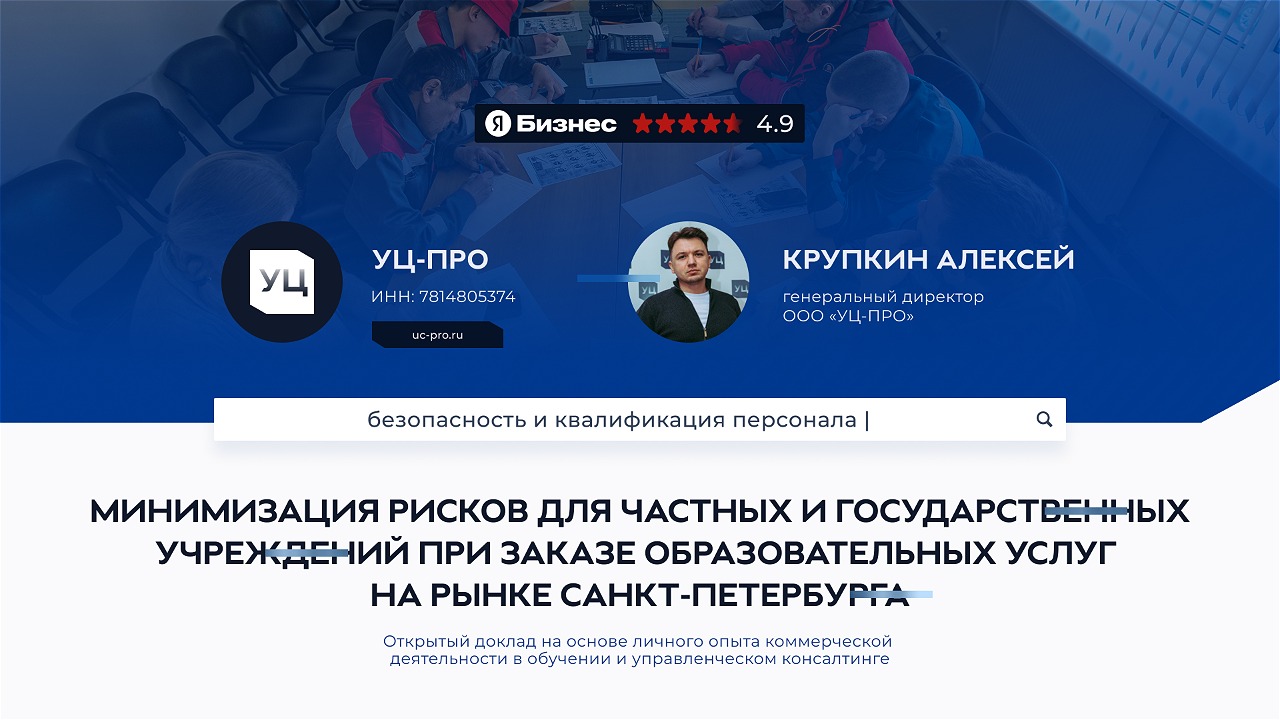 В ДК «Невская Ратуша» 28 августа прошел семинар по охране труда. Организатор — Комитет по социальной политике Санкт-Петербурга. Генеральный директор Алексей Крупкин поделился личным опытом работы частной образовательной организации на рынке техносферной безопасности. Доклад: «Минимизация рисков для частных и государственных учреждений при заказе образовательных услуг: безопасность и квалификация персонала».